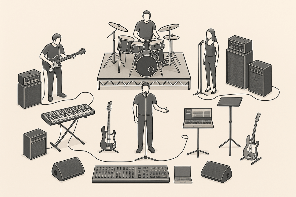- Ayudar en el montaje y desmontaje de equipos, garantizar la organización de cables y asegurar que los músicos tengan acceso rápido a todo lo que necesitan durante el espectáculo.